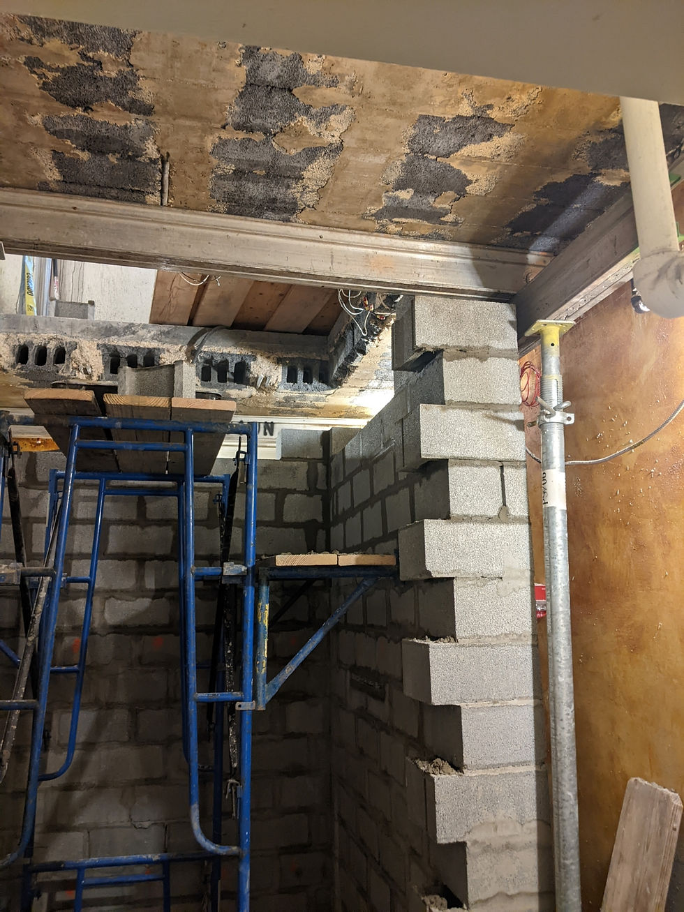 Work included the construction of multi-course CMU masonry partition walls in confined below-grade spaces, utilizing scaffolding to reach full wall heights. Concrete slabs were poured at the base of new masonry walls to serve as foundations and finished floor surfaces in utility and mechanical rooms. Conduit and piping penetrations were coordinated with MEP trades during the concrete placement.