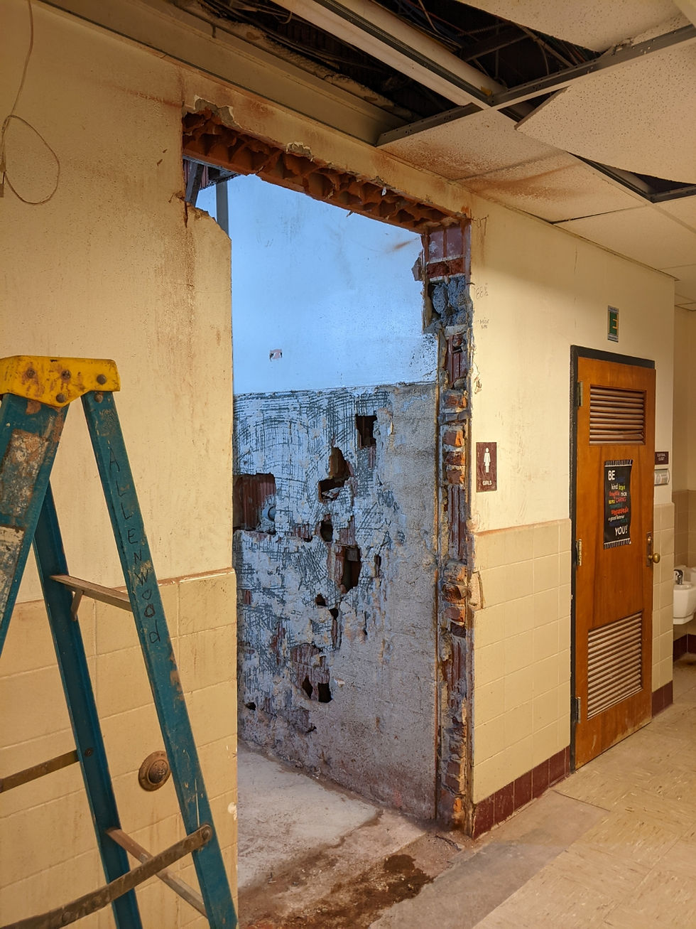 Work included the construction of new CMU partition walls with integrated steel door frames, requiring precise coordination with existing building systems. Crews executed selective demolition of existing masonry and tile walls to create new doorway openings, installed structural steel lintels to support the remaining wall structure above new openings, and placed temporary wood bracing during construction to maintain structural integrity.